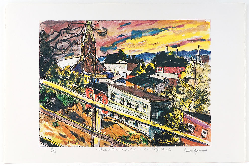Henri Masson Untitled Mixed media on paper 12 x 14 in Sold |  Henri Masson Untitled Lithograph 15 x 22 in sold |  Henri Masson From the artist portfolio “L’hommage aux Plouffe”; Ce quartier ouvrier, c’est mon âme Serigraph 16 x 12 in Sold |