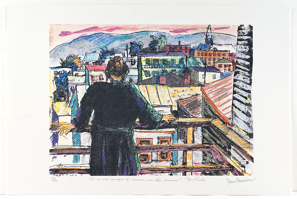 Henri Masson Untitled Mixed media on paper 12 x 14 in Sold |  Henri Masson Untitled Lithograph 15 x 22 in sold |  Henri Masson From the artist portfolio “L’hommage aux Plouffe”; Ce quartier ouvrier, c’est mon âme Serigraph 16 x 12 in Sold |